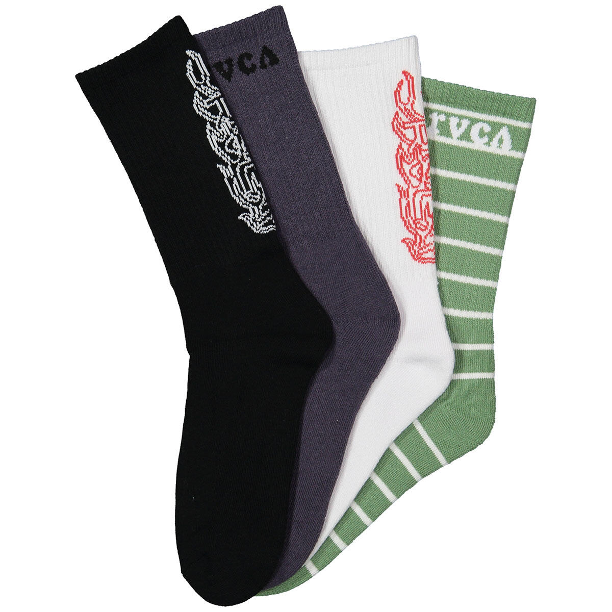 THIS RVCA 4-PACK OF SOCKS FEATURES SEASONAL PRINT COLOURWAYS WITH AN INTARSIA LOGO. COMES WITH 4 CLASSIC CREW STYLES IN GROOVY NEW PRINTS THAT WILL KEEP YOUR FEET PROTECTED AND LOOKIN' GOOD.