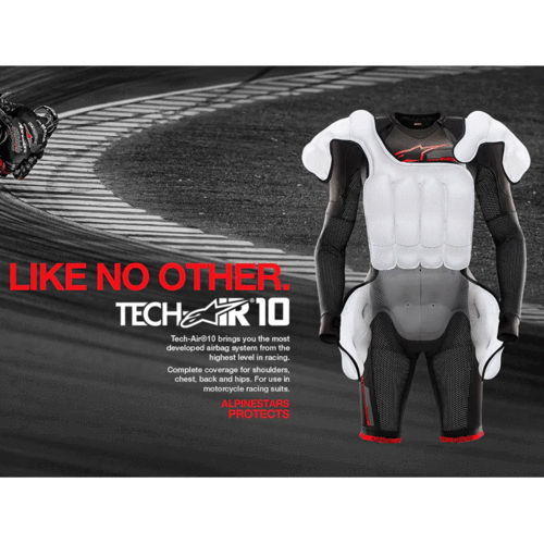 • Designed to protect a motorcycle rider’s shoulders, chest, full back and hips, Tech- Air® 10 provides the most comprehensive coverage of any airbag currently available.
