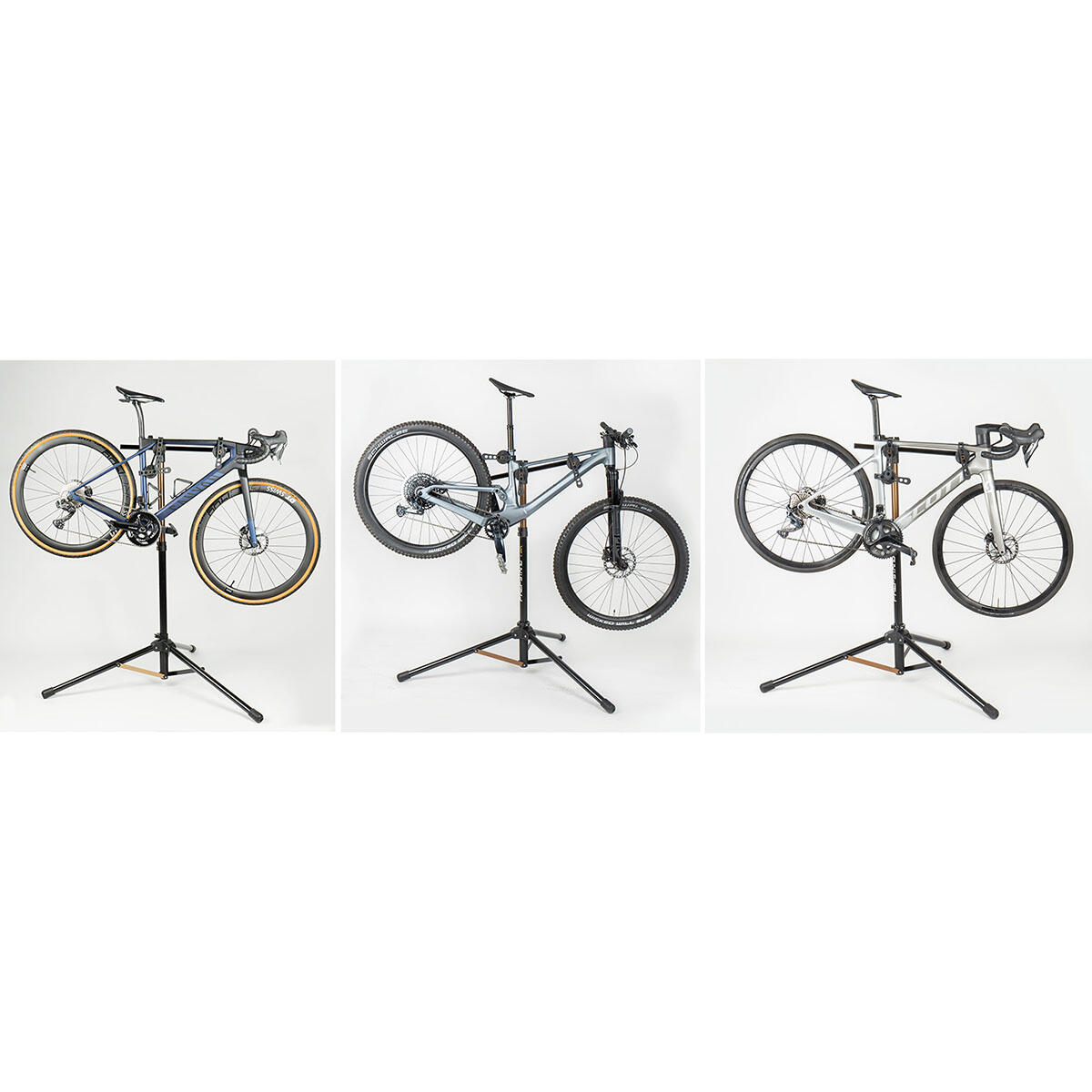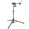 Unique adjustable 3-point anchor design workstand provides stability and eliminates damage to thin-walled and aero-shaped tubes. Three contact clamps with rubber straps are easily adjusted to fit any bicycle frame and mounts closer to the bike's center of gravity improving stability. Included handlebar stabilizer is length adjustable to fit most bikes to keep its handlebar and front wheel secure. Folds down compactly for storage.