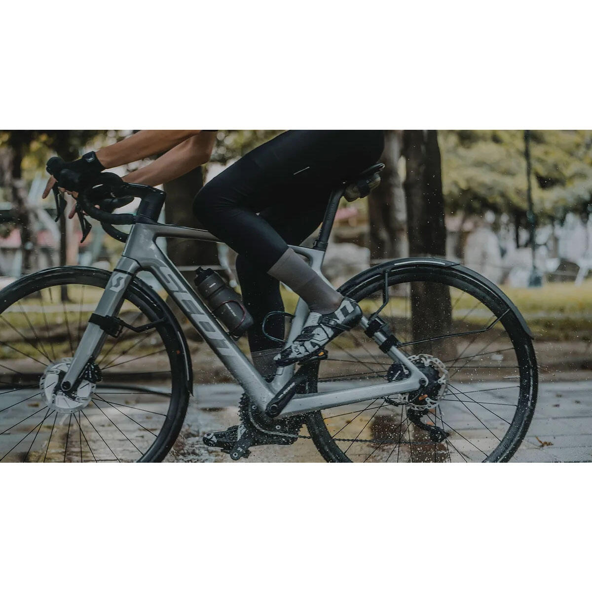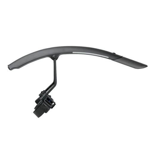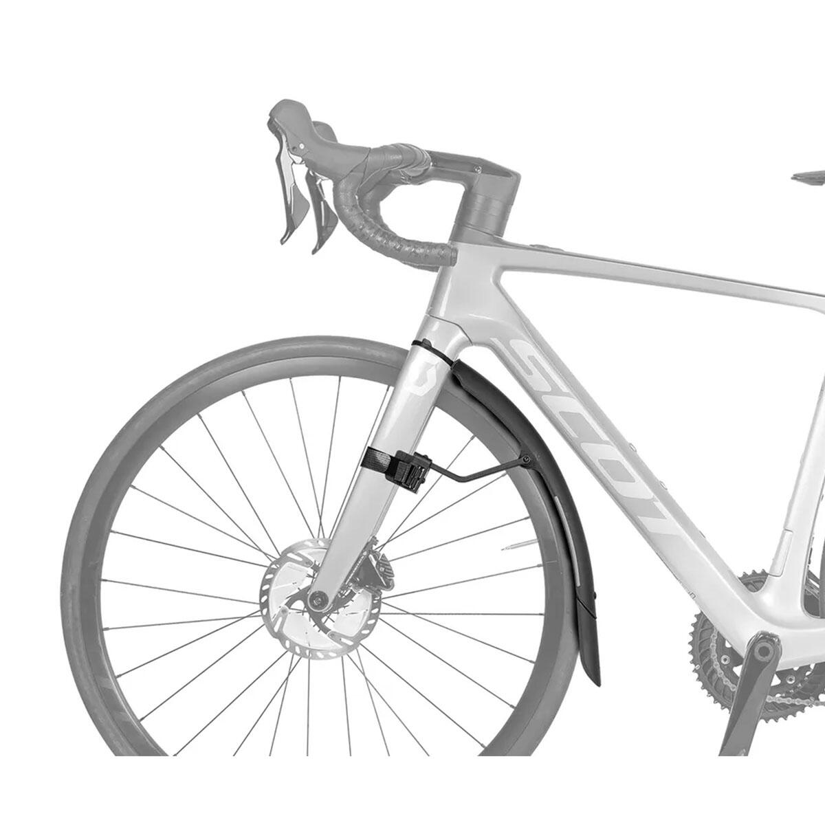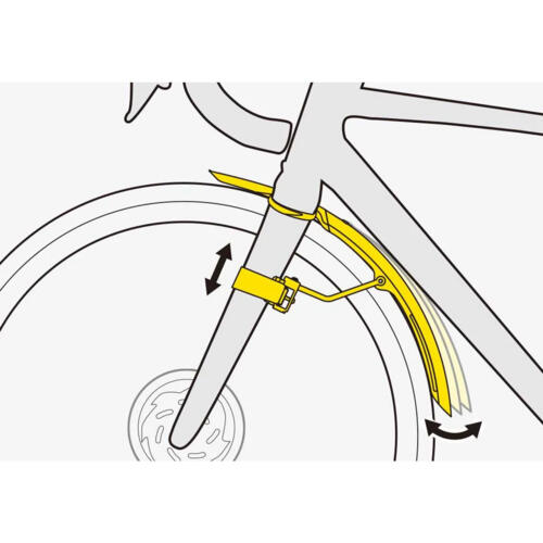 The perfect quick-mount, dual color front fender that attaches to road bike forks with hook and loop straps easily and securely. Adjustable struts provide a closer fit to the tire and excellent mud / spray protection while the highly polished underside helps prevent dirt buildup and aids in cleaning. Included 3M reflective decals provide safety at night.