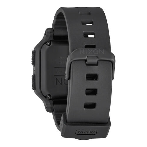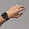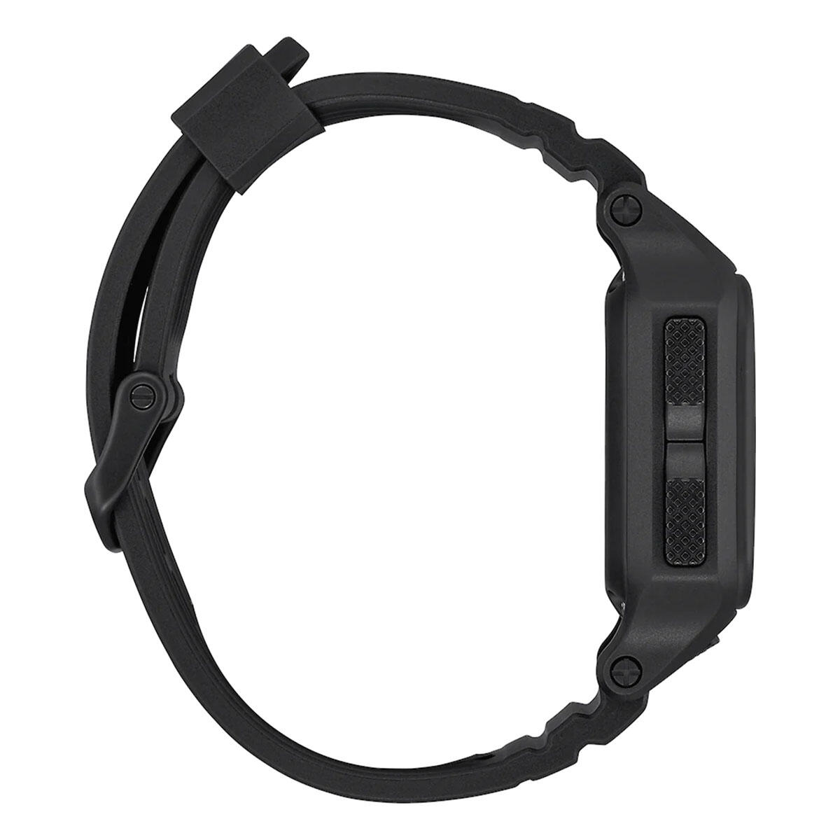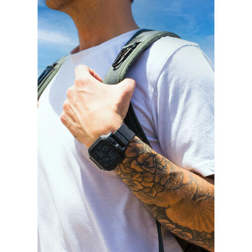 - An ultra-durable 44.5mm case with custom, injection-molded fiber and reinforced polycarbonate. The LCD module is encased in a protective Poron housing for super tough shock absorption. A 24mm custom, injection-molded and free-swing TPU 80 band is upgraded with water flow texture on the button side and a patented locking looper.