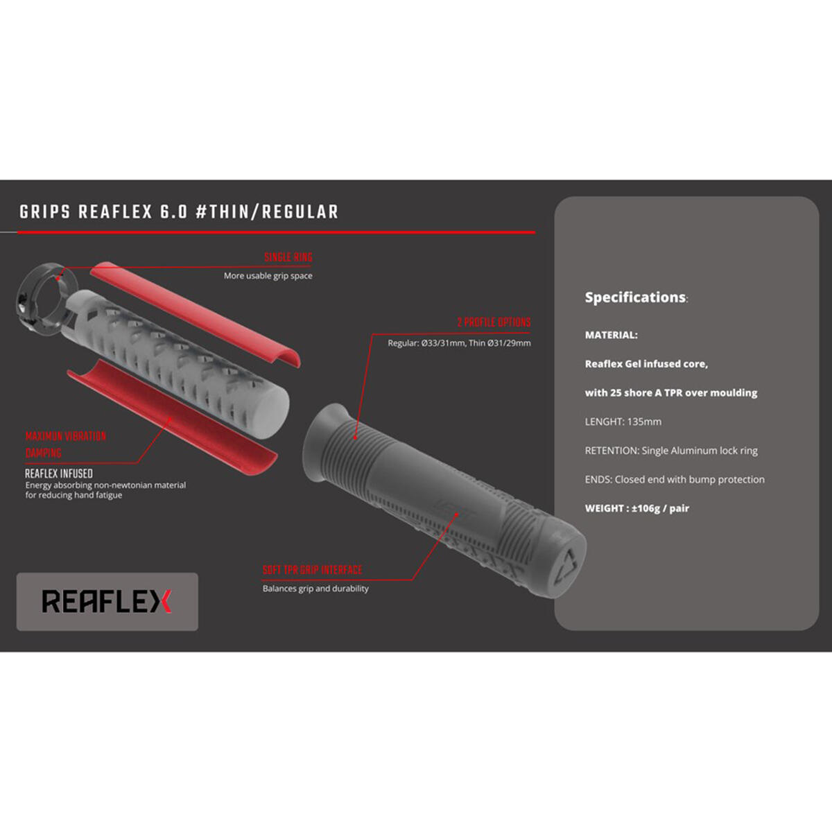 - The grip core is infused with our energy-absorbing non-newtonian Reaflex gel, noticeably reducing vibrations transmitted to the rider, thus reducing hand fatigue and arm pumps.