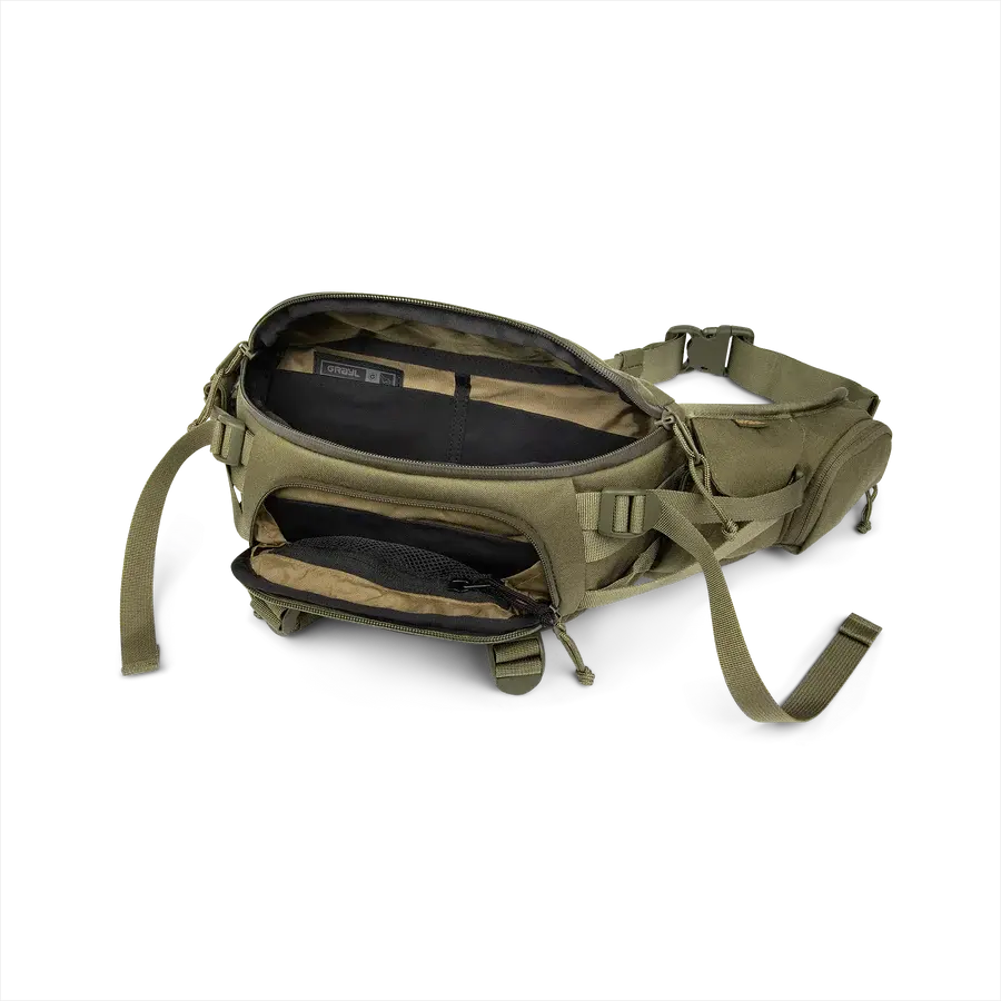 - Gear Organization. 2.5-liter utility waist pack with dual zipper top main compartment, wrap-around mesh internal zip pockets, stretch-woven card slot pockets, key leash, and clip.