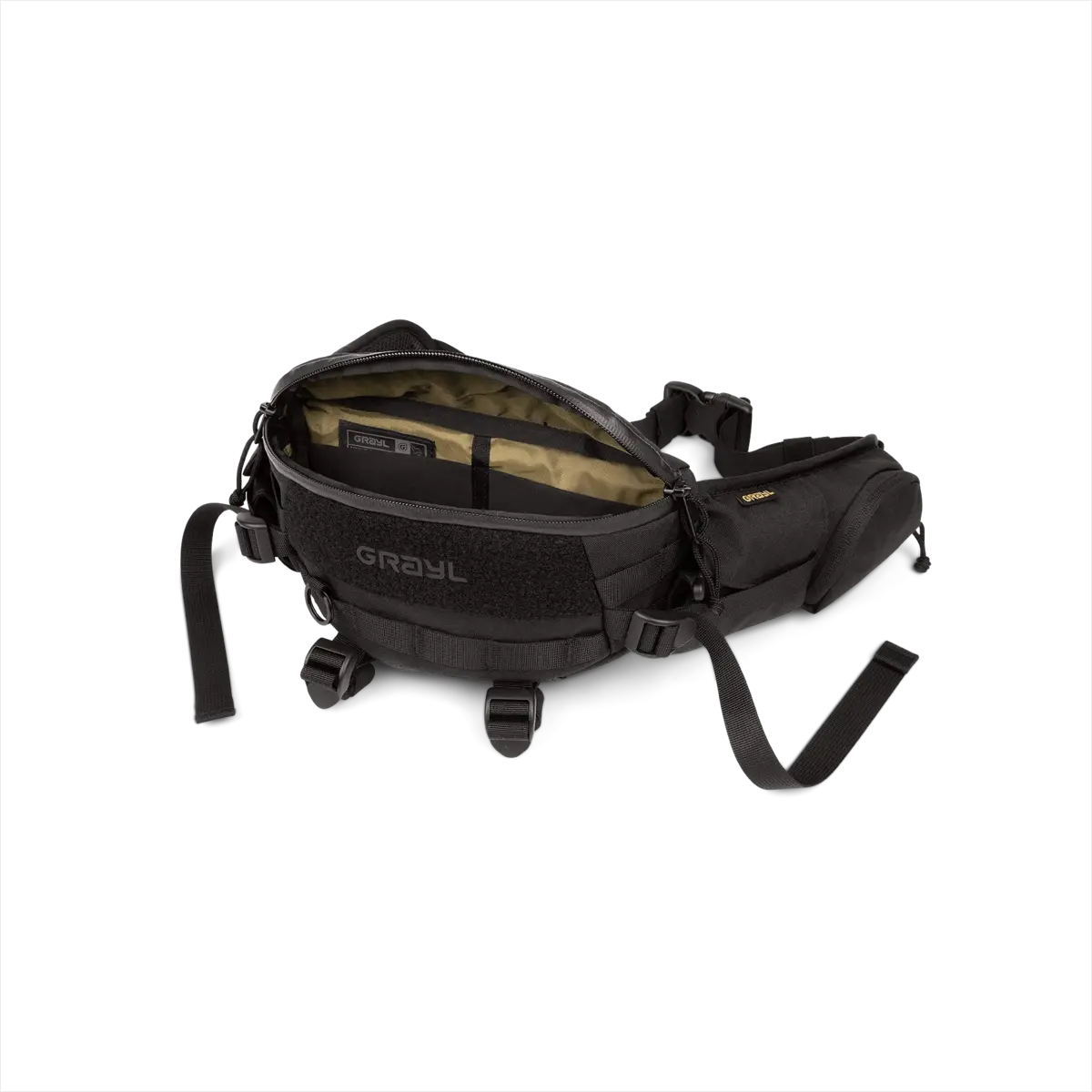 Molle ridden Mission EXP™ Hip Packs are overbuilt for maximum storage and comfort in the outdoors. Equipped with an internal pocket system, you can take what you need and compartmentalize with ease. Designed for your Grayl, our Expanse BottleDrop™ and BottleLock® storage systems offer you a multitude of options to carry any water bottle and essential gear. Velcro loop with a clip-in metal o-ring allows is an idyllic landing spot for grab-n-go G-Mod Velcro Accessory Pouches for quick and easy access to compact items. Constructed with 100% recycled nylon, stretch woven fabrics, YKK water-resistant zips, and premium hardware. Available in 2.0L, 2.5L and 4.5L capacities; each expandable by up to two liters when extra volume is needed by deploying the Expanse BottleDrop™ Pockets.