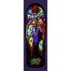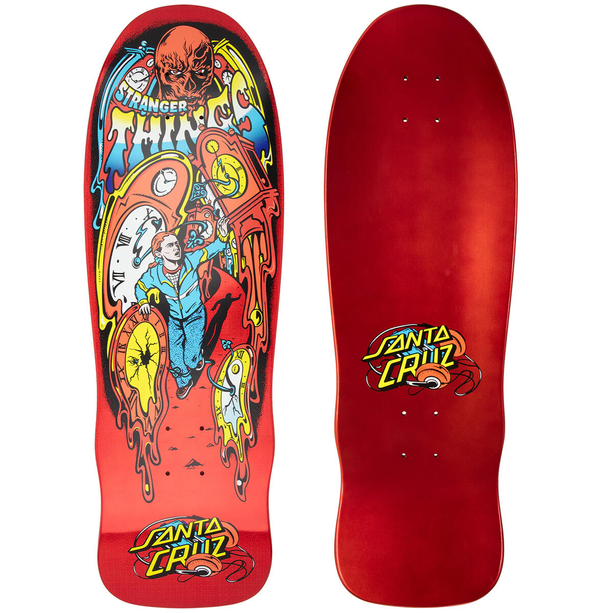 The Santa Cruz Stranger Things Grabke Max Melting Clock 9.7in x 29.4in deck features multicolor glow in the dark graphics on Claus Grabke's classic Melting Clock shape.