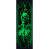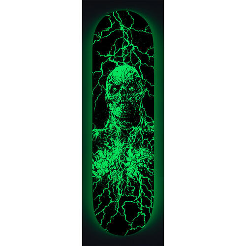 The Santa Cruz Stranger Things Vecna 8.5in x 32.2in Santa Cruz deck features green glow in the dark Vecna graphics on the bottom of a fully dipped classic glow in the dark green 8.5 Santa Cruz deck.
