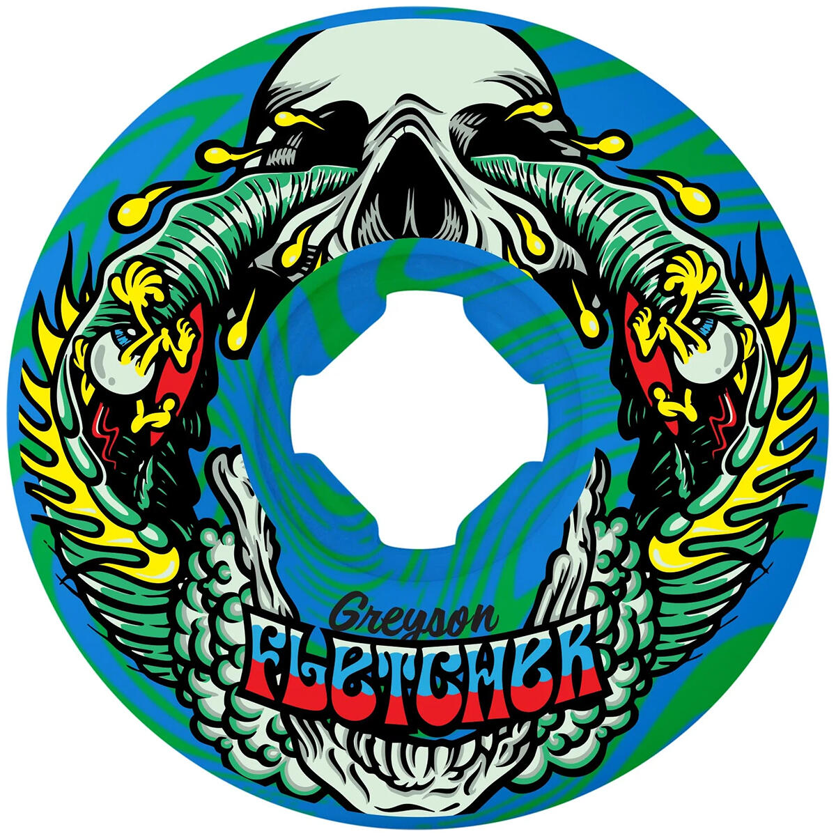 Slime Balls 56mm, 99a Greyson Fletcher Guest Pro Mini Vomit wheels feature blue / green swirl high performance 99a urethane come with a Slime Balls Greyson Fletcher prismatic 3.5" x 3.5' decal.