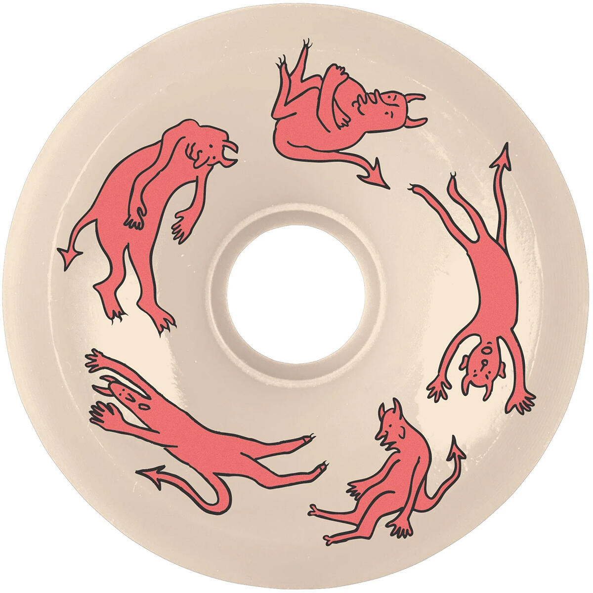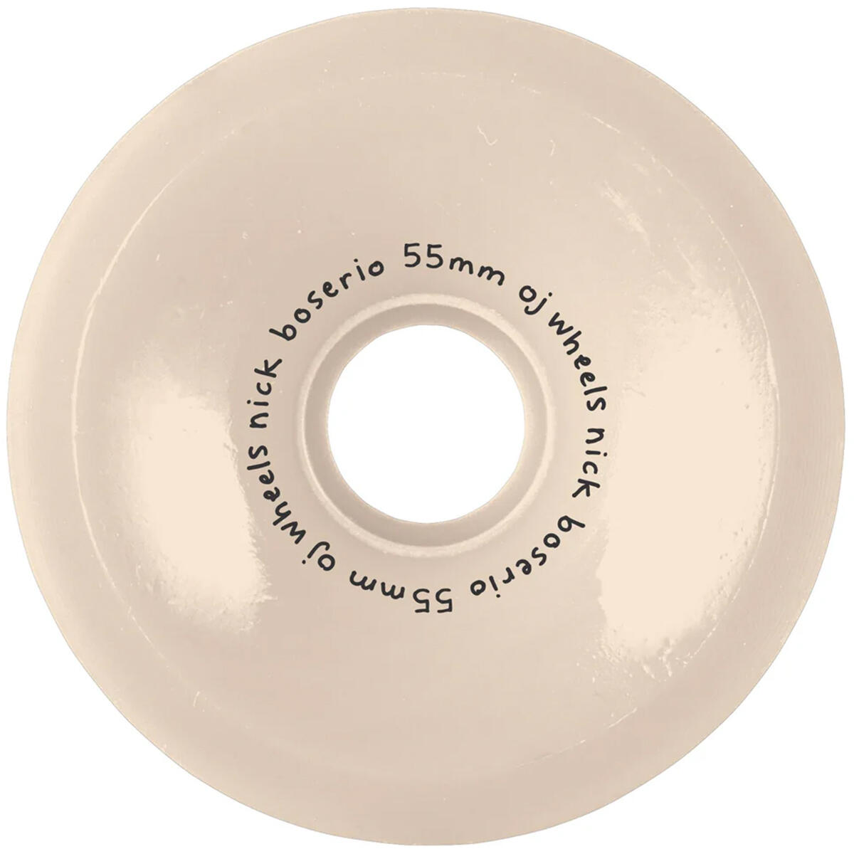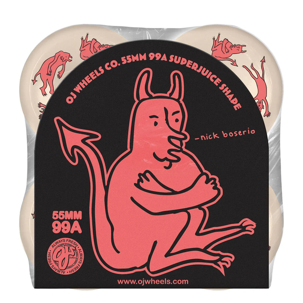 The 55mm Nick Boserio Little Devils Original White 99a OJ Wheels feature OJ's original urethane formula in 99a on the 55mm Mini Super Juice shape with Nick Broserio's Little Devils artwork.