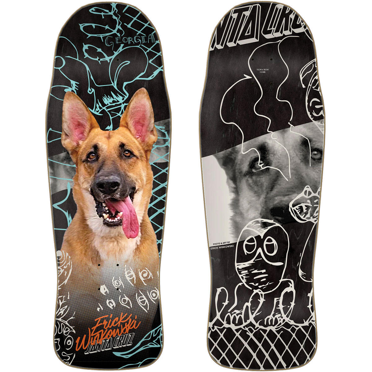 The Santa Cruz Skateboards Winkowski Tribute Pro Shaped deck is a tribute to Erick's friend Georgia. Digitally printed in color on bottom and black and white on deck top. On Erick's custom shape with a 15" wheelbase. Photo and artwork by Erick Winkowski.