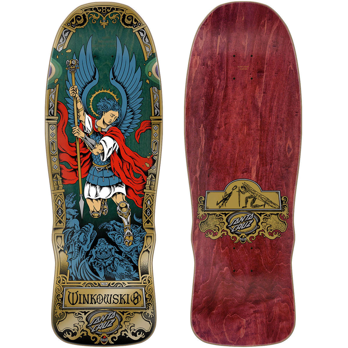 The Santa Cruz Skateboards Winkowski Archangel Pro Shaped deck features silver and gold metallic Winkowski Archangel artwork over teal stain deck bottom with smaller metallic gold Archangel artwork on burgundy stain deck top, on Erick's custom shape with a 15" wheelbase.