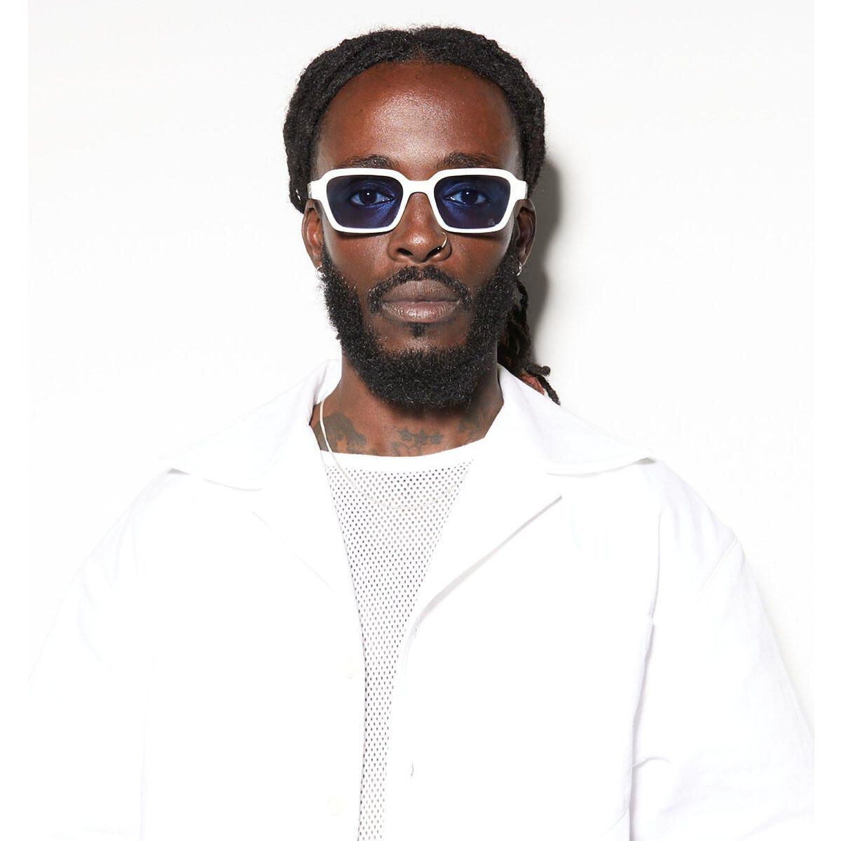 signature szade ; clean lines in a statement squared off silhouette. signature super creamy off white colourway with our most loved blue tinted lenses.