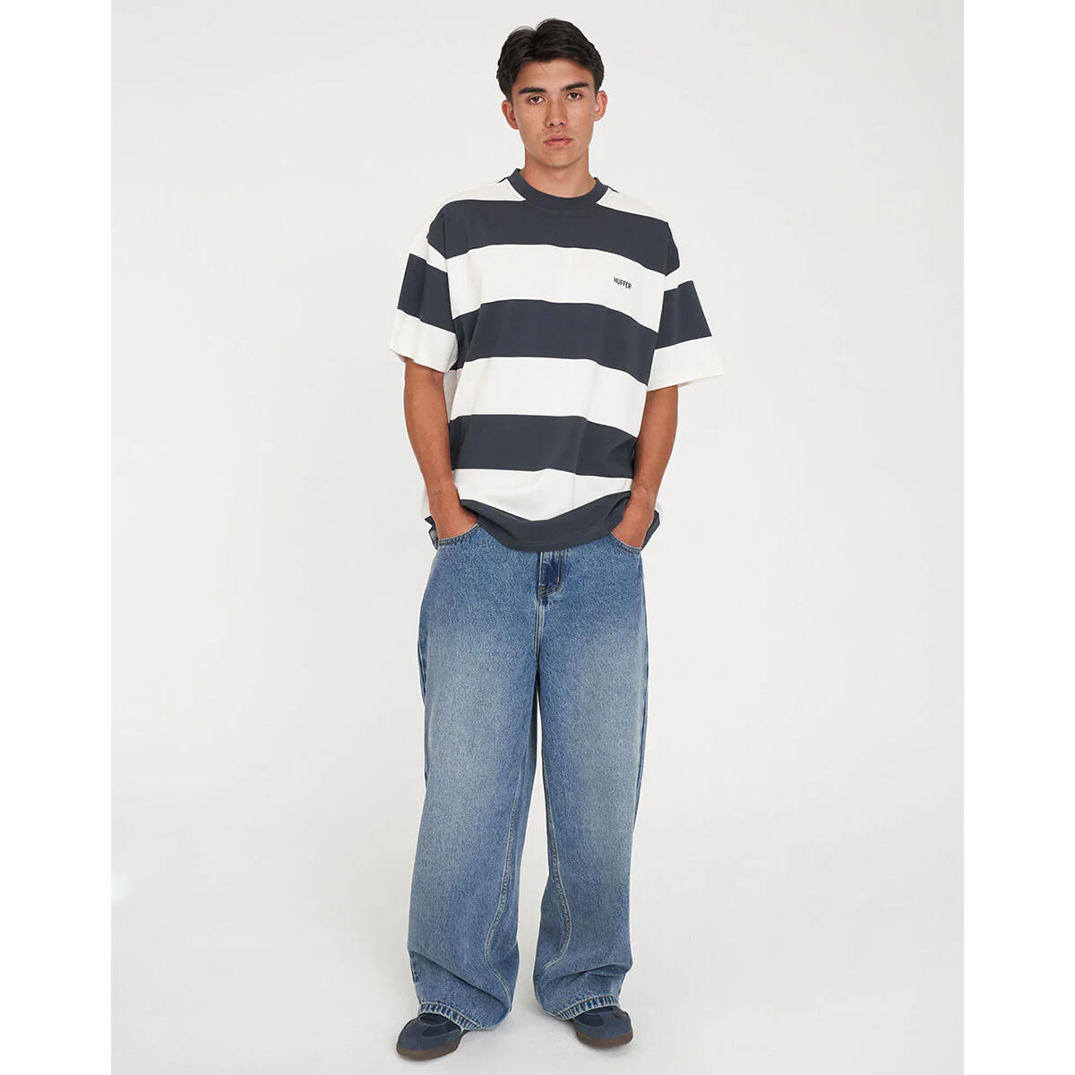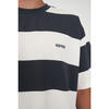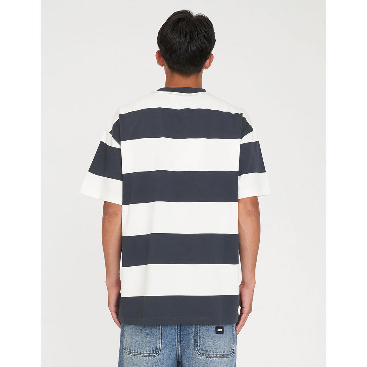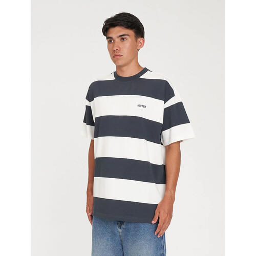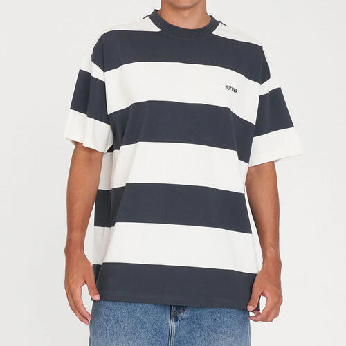 • What you need to know: 100% Cotton, 280gsm, Rugby knit, 25mm Neck rib, Custom Huffer yarn dyed stripe, Relaxed fit, Short sleeve, Huffer branded placement embroidery