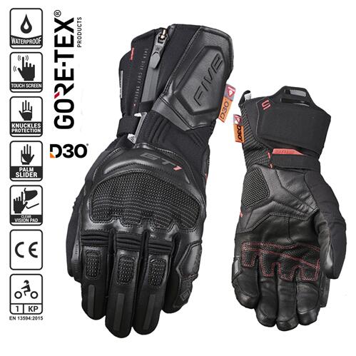 A Gore-Tex® Grand Touring glove that will ride with you to the ends of the earth. As the ultimate road touring motorcycle glove, the GT1 EVO GTX has all you need to rack up the kilometres in total comfort. With supple leather and Syntech Skin™ construction, a GORE-TEX® Grip™ membrane, lightweight Primaloft® 80g thermal insulation, ERGO PROTECH® protective shells in D3O®, and an ergonomic screen wiper, FIVE have taken their innovation the extra distance… so that you can travel far!