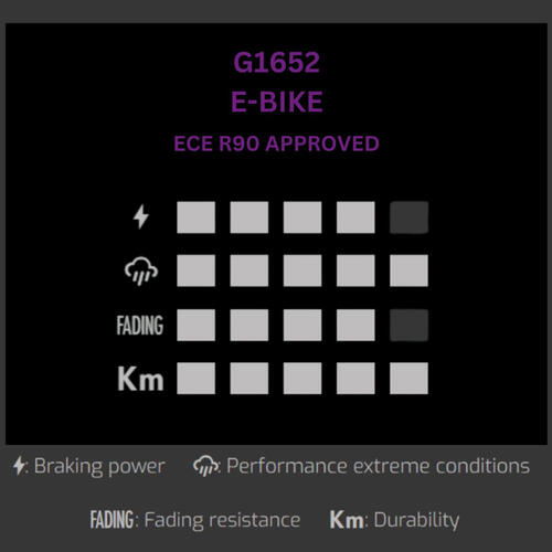 The new G1652 compound stands out for its resistance to high temperatures, strong braking power, exceptional durability and absence of noise. It has been developed specifically to meet the added demands placed on braking systems by the additional speed and weight of electric bicycles.