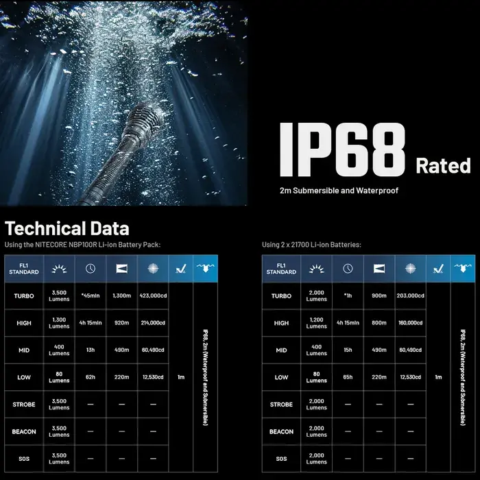 A NITECORE NBP100R rechargeable Li-ion battery pack is included that fits snugly without rattling inside the flashlight. Equipped with a USB-C charging port, it can also double as an emergency power supply.