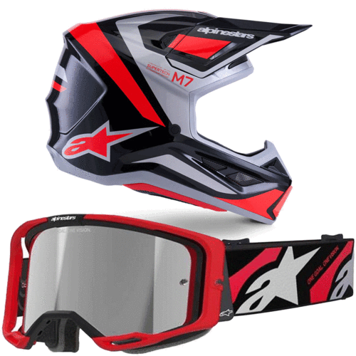 Alpinestars 2026 S-M7 Rise Helmet Black/Silver/Red And Vision Luar 8 Goggle Red/Black