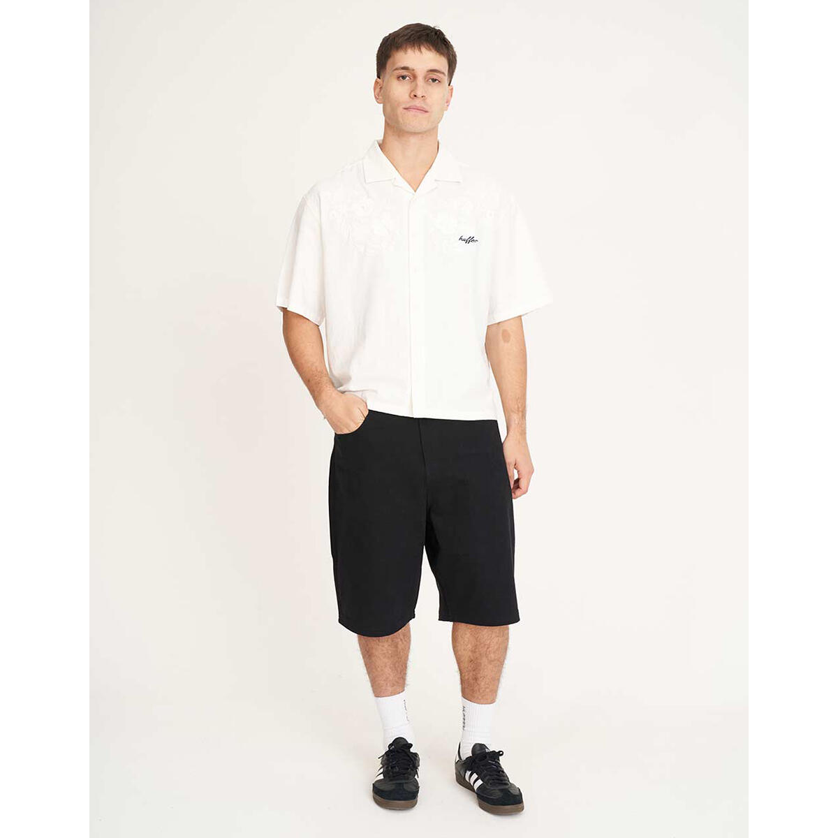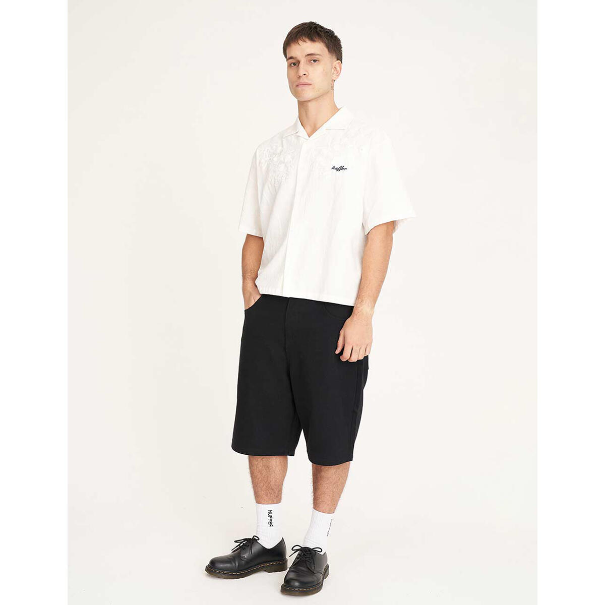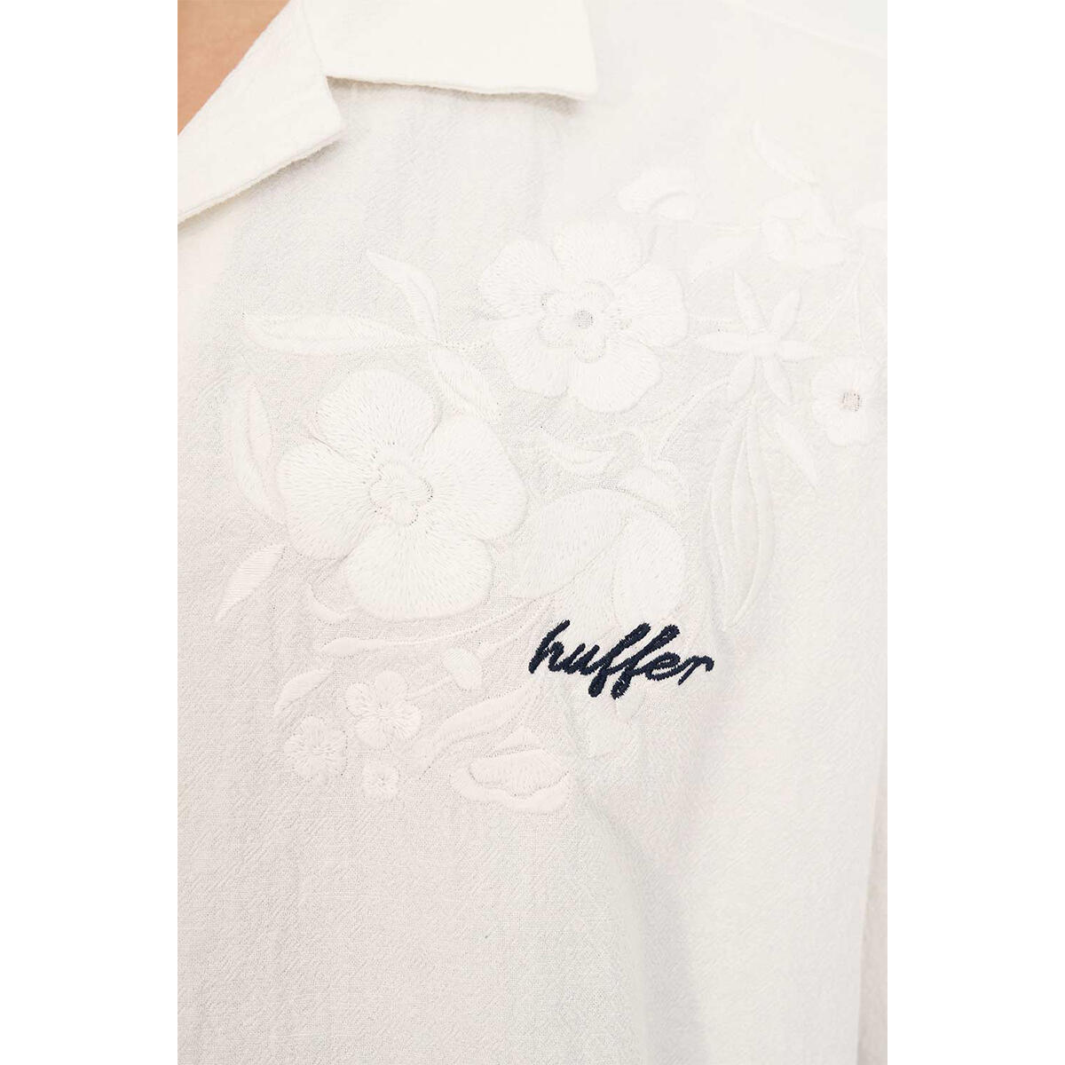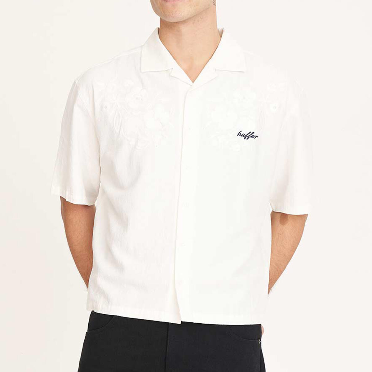 • What you need to know: 150gsm 55% Linen 45% Cotton, short sleeve, relaxed fit, camp collar with Huffer branded buttons & embroidery