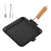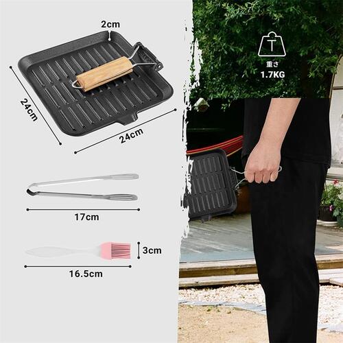 Size: Approx. 24 x 24cm. Weight: approx. 1.7kg. Material: cast iron, bamboo. Comes with 1x grill pan, 1x cooking tongs (food grade 304 stainless steel) and 1x cooking brush.