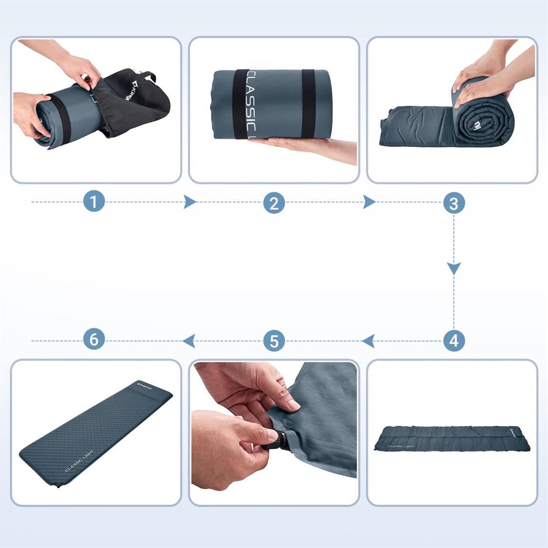4. Compact Folding Technique: Achieve hassle-free packing with our innovative folding technique. Unfold the pad, roll it to the top, open the valve, let the air flow out, and close the valve. Repeat until the mat is compact enough to fit into the provided handbag (approximately 3-5 times). Effortless setup and takedown ensure you spend more time enjoying your outdoor adventures.