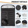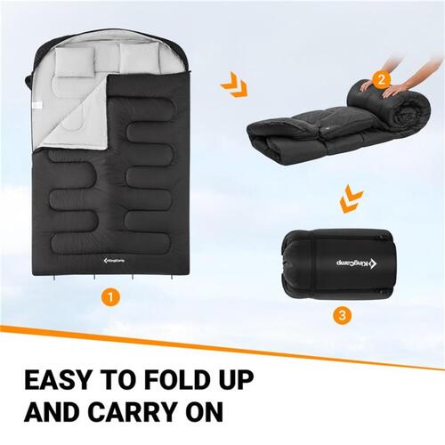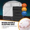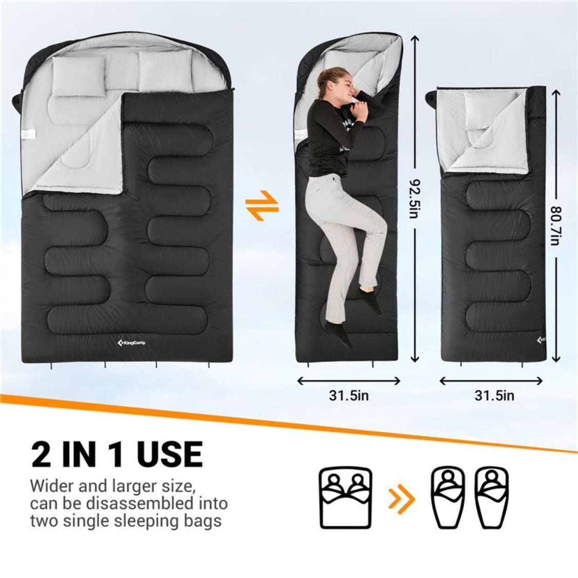 Ideal size for 2 people. Anatomical hood with drawstring perfectly protects heads from the cold. The sleeping bag can be unzipped into 2 halves and turned into two separate sleeping bags. The package includes 2 comfortable pillows in the same color and quality as the inner material of the sleeping bag. A flap with Velcro prevents the zipper from opening by the head. Zipper with two double-sided sliders.