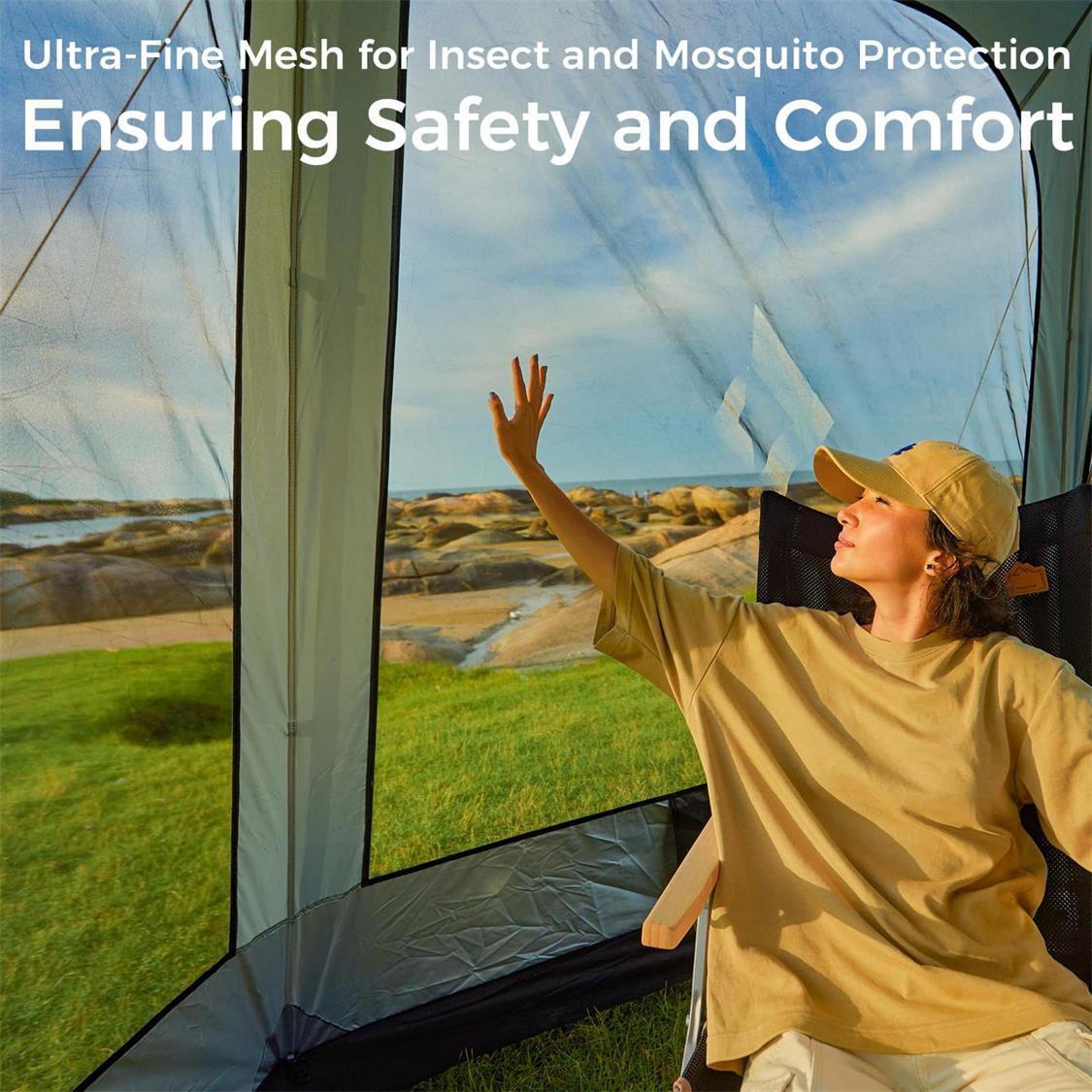 Experience unparalleled comfort and safety with our uniquely designed hexagonal tent, perfect for outdoor activities. This spacious shelter can accommodate multiple friends, making it ideal for gatherings. The stable structure ensures a secure setup, while the detachable mat and inner skirt effectively prevent mosquitoes and dirt.