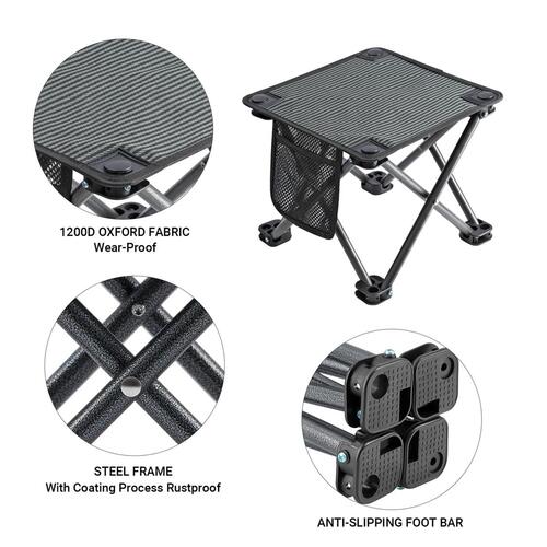 Convenient Features: Equipped with a handy side pocket for personal belongings such as keys, phone, or a beverage, this camping stool offers added convenience. Its four non-slip large feet ensure stability on both soft ground, like the beach, and hard ground, such as mountain terrain.
