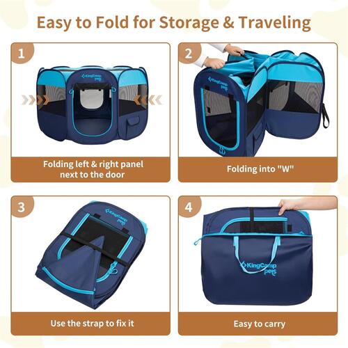 - Enjoy the convenience of quick setup with our foldable pet playpen. No tools are required – simply remove it from the storage bag and unfold in seconds. Featuring self-retracting elastic straps, it's effortlessly portable and can be used indoors, outdoors, while traveling, camping, and more. The zippered outer pocket ensures hassle-free transportation and storage.