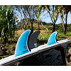 "Being pure foiled fiberglass, the construction of my new Futures Fin set mirrors the tradition flex characteristics of a hand-foiled fin cut from a multi layered fiberglass fin panel. The twin + 1 configuration gives the board a twin fin performance feel, with additional speed and maneuverability. The small rear stabilizer fin adds a degree of positive control and predictability.