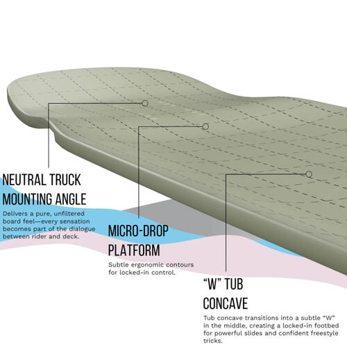 • Our brand spanking new Supernova mold is a game changer. Finely tuned double kicks deliver instant pop and effortless ollies. From big shuvits to nose-blunt slides, these kicks give you precise leverage to defy gravity and hit unseen angles. A subtle “W” dip in the center, tub concave, and micro drop ergonomically cradle your feet, making the board an extension of your body