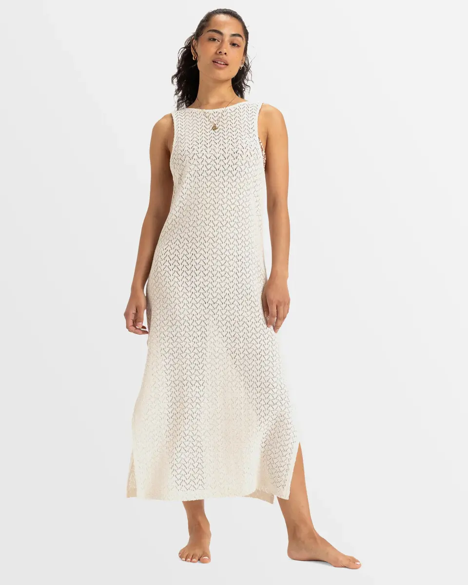 Slip into the Playa Mood Crochet Long Dress and let the island vibes take over. This breezy cotton-blend crochet number features a deep, flirty neckline and sassy side slit for effortless, boho style. Pair it with sandals and a sun hat for a carefree, sun-kissed look that's perfect for beachy strolls or backyard barbecues. Featured here in the Egret colorway