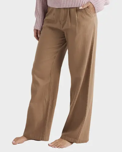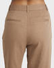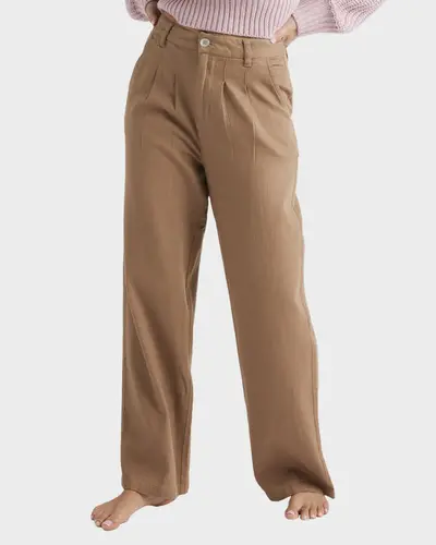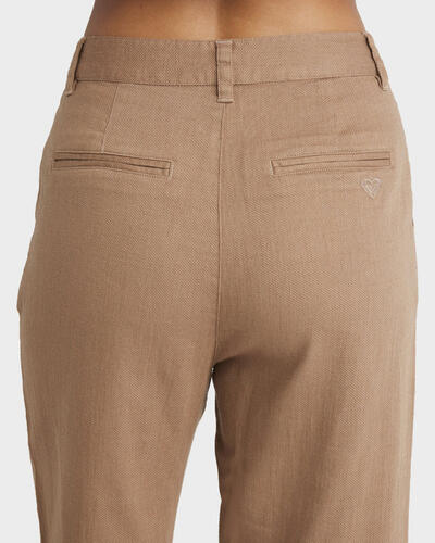 Fixed waistband closed by 1 Roxy metal button Front zip fly closure Slash front pockets Front pleats Piped pockets at back Tonal Roxy logo emby at back pocket.