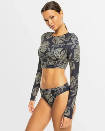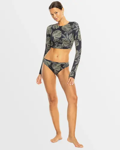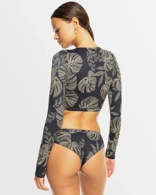 Slip into this printed ROXY Pro Nose Ride Long Sleeve Crop Surf Top and get ready to rule the waves. Crafted from a partially recycled nylon and elastane blend that's soft, strong, and chlorine-resistant, this fitted crop top delivers style, comfort, and performance. The long sleeves and ROXY branding add a signature pro-level touch to your surf sessions. Featured here in the Anthracite The Palms Wetsuit colorway.