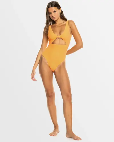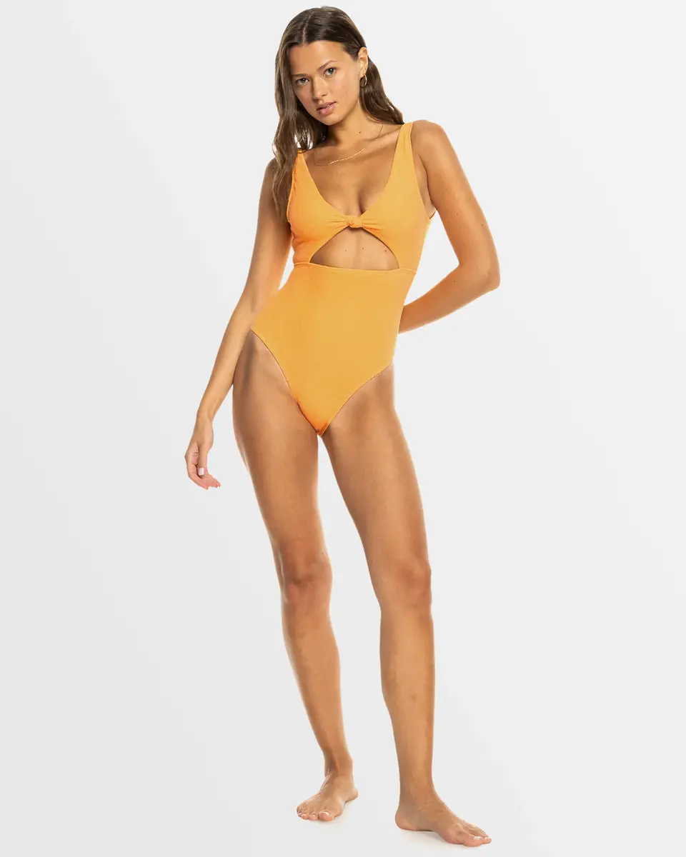 Dive into effortless style with the Dalia One Piece Swimsuit from ROXY. Crafted from a soft, strong, and stretchy partially recycled blended nylon fabric, this fashion-forward one-piece offers medium coverage and removable pads for a customizable fit. The scoop neck and knot detail at the center front add an on-trend edge, while the ROXY branding lends an iconic look. Make a splash this season in this stylish swimsuit. Featured here in the Papaya colorway.