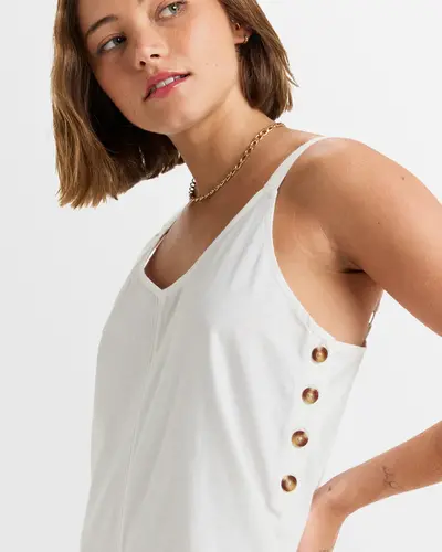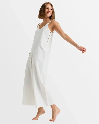 Embrace effortless summer style with this breezy cotton-linen romper. The easy fit and adjustable straps ensure all-day comfort, while the v-neck and side pockets add a touch of casual chic. Perfect for beach days or backyard barbecues