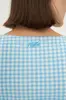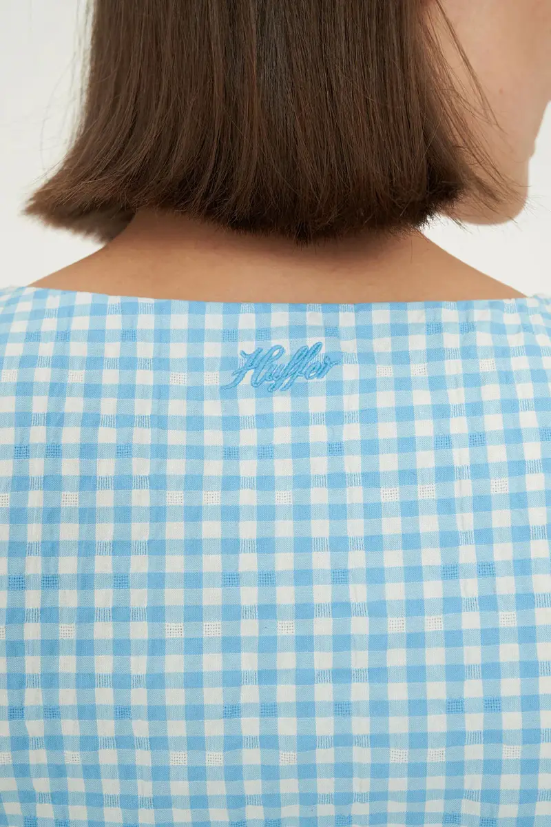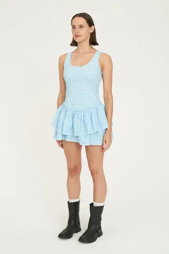 • What you need to know: 95% Cotton 5% Elastane, 140gsm, Custom Huffer gingham, Lace trim bodice, Lace up back detail, Tiered skirt, Mini length, Huffer branded placement embroidery