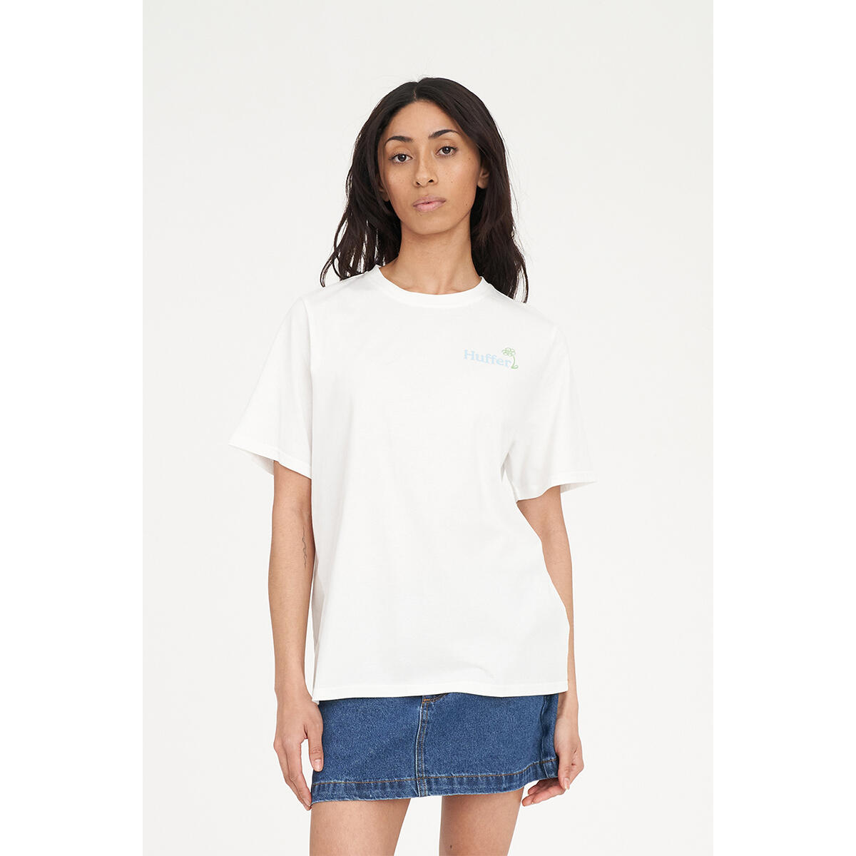 100% Cotton / 170gsm / 15mm Neck rib / Standard weight jersey / Custom Huffer piece dyed colour / Classic fit / Short sleeve / Huffer branded placement embroidered