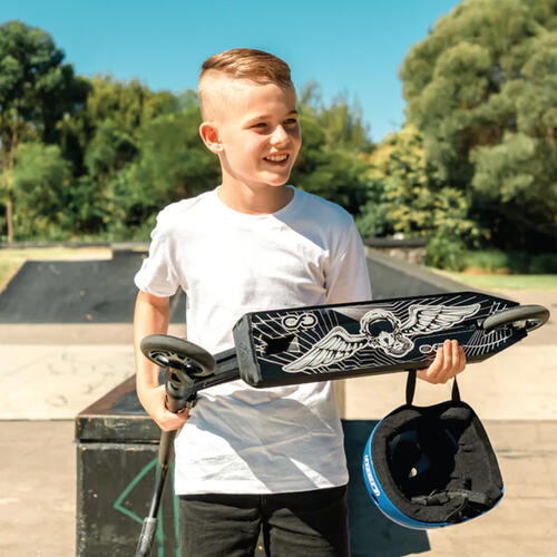 One of the standout features of the FLY is its 120mm alloy core spoke wheels, which provide an incredibly smooth ride on any type of terrain. Complementing these wheels are the expertly laser-engraved large wing FLY graphics, adding a touch of flair to the sleek anodized matte black finish on the deck.