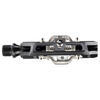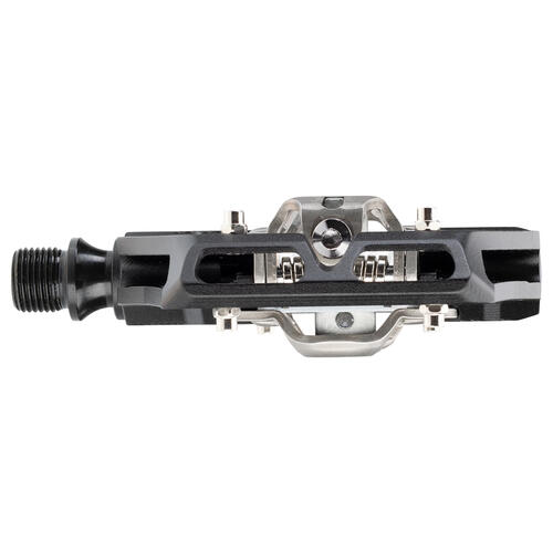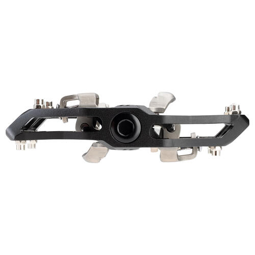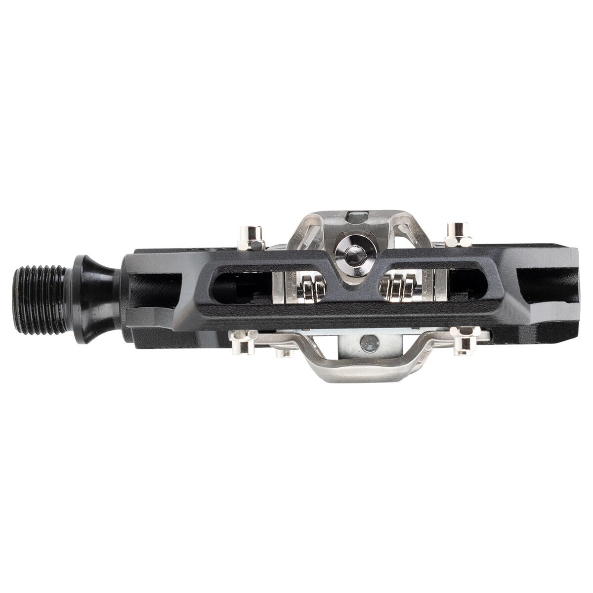 A Gravity clipless pedal body CNC-machined out of 6061-T6 aluminum. It utilizes an ultra-robust forged and CNC-machined chromoly steel axle. The fully serviceable triple-bearings system consists of a LSL self-lubricating bushing, a needle bearing, and an industrial roller bearing. Quad seals keep the internals remain dry in any conditions. The dual-sided clip-in system is compatible with classic SPD cleats. The retention system has an adjustable spring tension to finetune entry and relase, while offering 5 degrees of free float. The large platform around the clip-in system provides a solid shoe support for optimized control and power transfer. The pedal is tested and certified to EFBE EPAC Gravity TRI-TEST® standard (category 5).