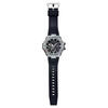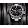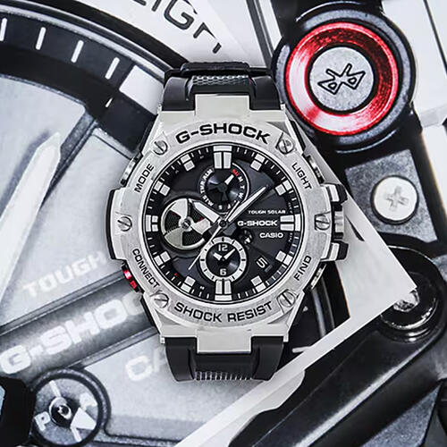 A G-STEEL model featuring a solid case, a chronograph with an analog display, and a urethane band designed with a motif of heavy jet engine blades. A dual-coil motor in a rotating disc dial placed at 9 o'clock moves the dial blades and exudes a functional beauty. In addition to the alarm on/off function and using the rotation to show the stopwatch, etc., it also functions as a battery indicator, contributing to a tough chronograph. The layer guard structure and high-density mounting technology have allowed the module to be smaller and thinner, improving wearability and overall watch quality. It is also equipped with Bluetooth® connectivity that enables accurate time acquisition via your smartphone. Its Tough Solar feature allows it to run stably, and it is also equipped with practical functions such as high-brightness LEDs and dual-dial world time.