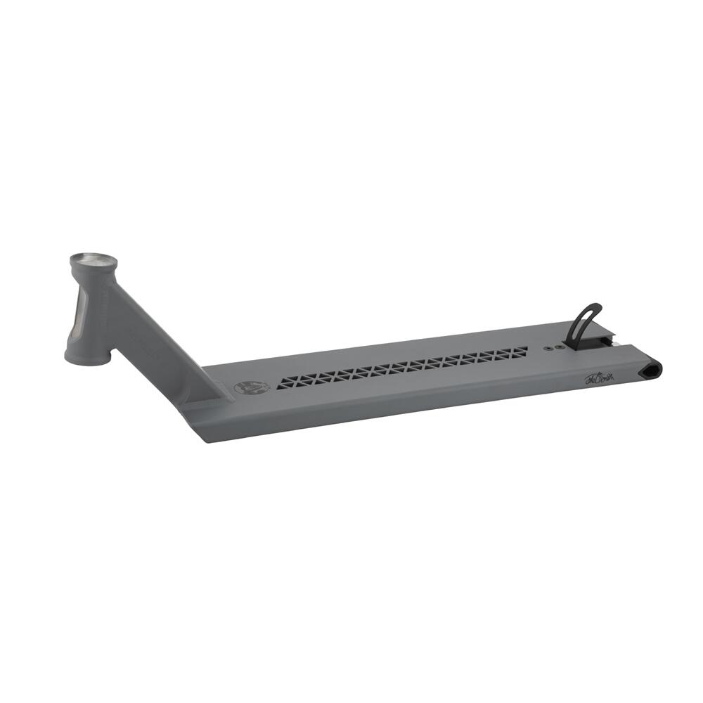The headtube has been simplified to make sure the welding area in-between the neck and headtube is flat and optimized for strength and also features weight reducing fluting and cut-outs externally and internally. The Extrusion will now be 6 and 6.5 inch with a perforated foot plate to reduce weight while also being easy to griptape over so that the rider is not limited by a large cut out through the top. The deck will come with a steel feather-light brake and replaceable aluminium back ends that are deeper set into the extrusion with single hex key tightening.