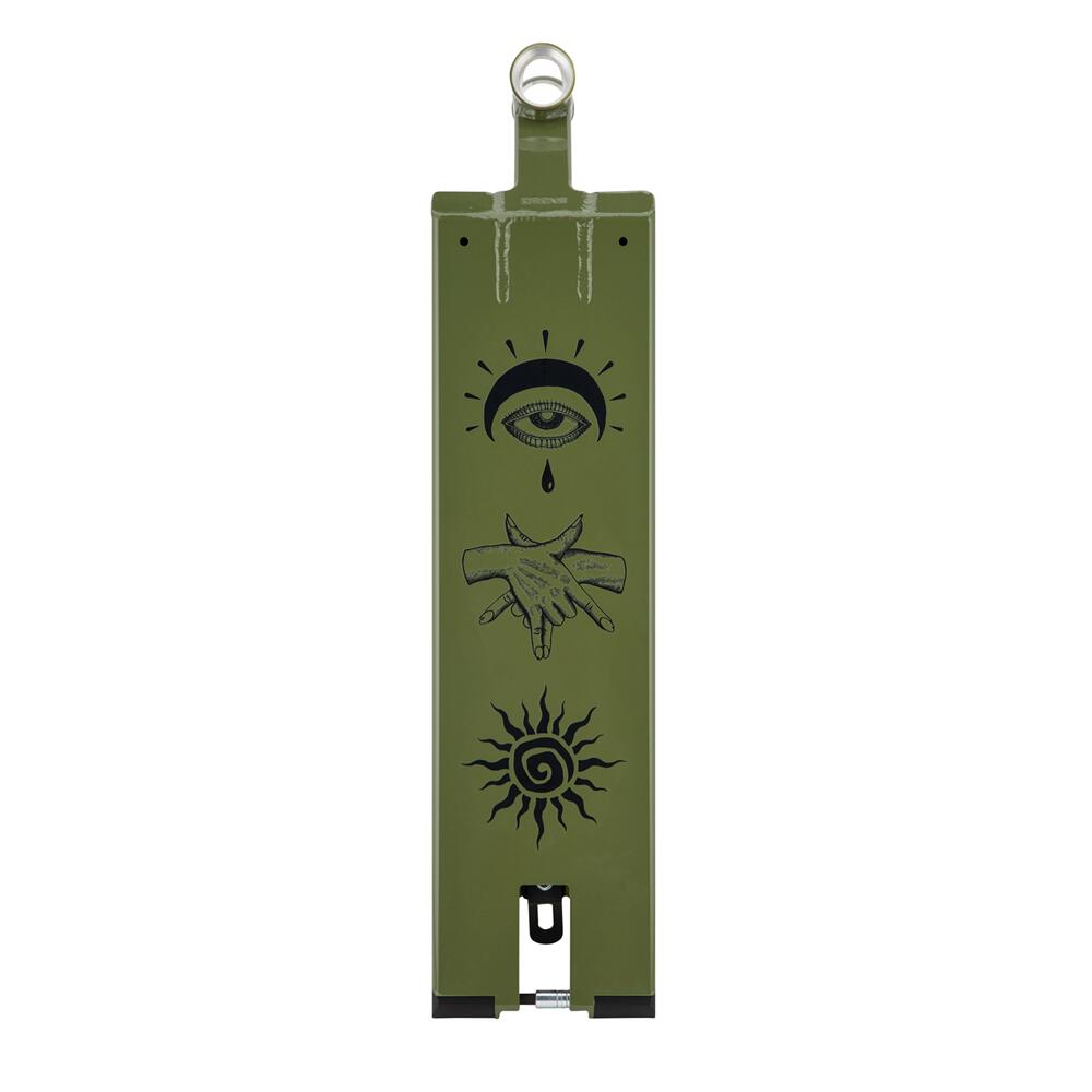 The 84 degree headtube and neck has been extruded and then CNC'd and has been designed with a wider base to account for the bigger stresses created by a larger deck plate and heavier street riding. The headtube has been simplified to make sure the welding area in-between the neck and headtube is flat and optimized for strength and features weight reducing fluting and cut-outs externally and internally.