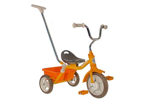 The Passenger tricycle is the orange trike with rear push handle with a tradtional line and classic colours. Perfect for learning balance first and then pedalling action.