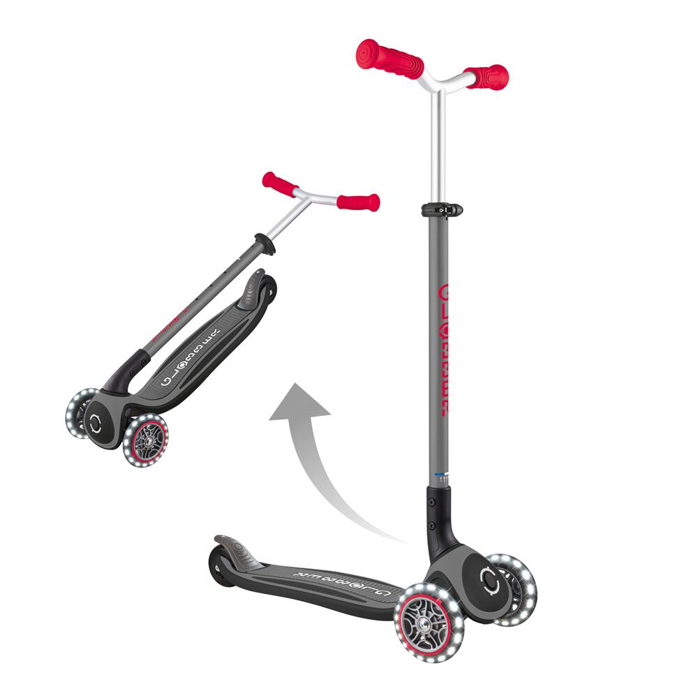 Globber�s MASTER LIGHTS scooter is a foldable scooter for kids, thanks to Globber's patented folding mechanism with a push button; folding a scooter is fast & easy! Easily fold the 3-wheel scooter with just a push of a button, allowing easy transportation in trolley mode