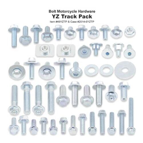 The YZ Track Pack contains the hardware that is needed and replaced often on Yamaha's. Includes Yamaha style M6 and M8 flange bolts, seat bolts, fork guard bolts, radiator shroud bolts, chain slider bolts, t-nuts, flange nuts and more. Designed for YZ, YZF and WRF models.