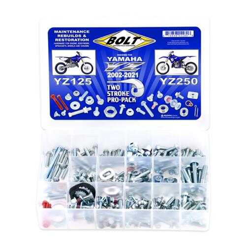 Bolt's two-Stroke Pro-Packs are jam-packed with factory-style hardware for a full restoration of all body work, aluminium bushings, rotor bolts, sprocket bolts, Fuji lock nuts, and drain plug washers. Also includes all the external fasteners for the engine. Organised container includes a placement guide to ensure proper fitment.