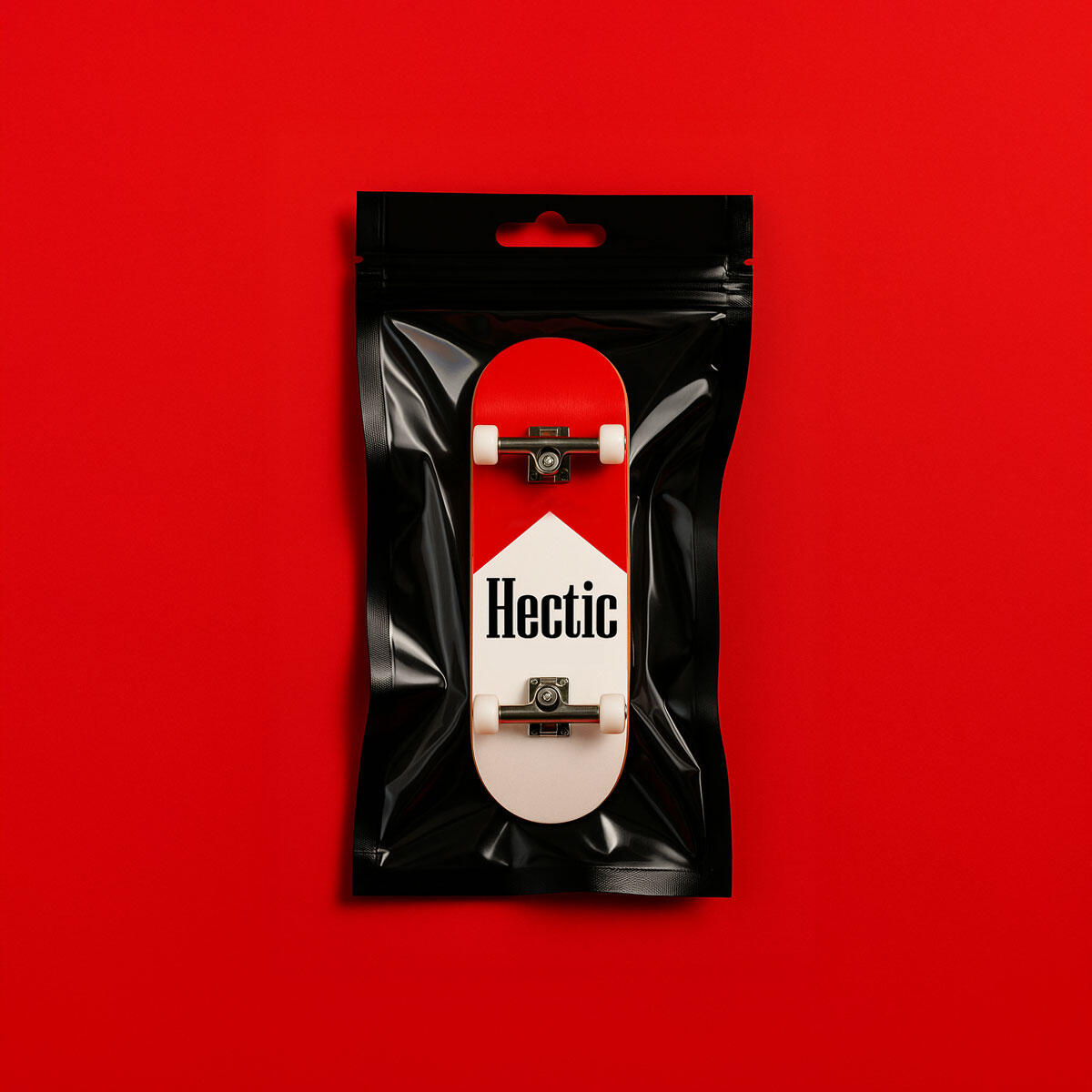 Hectic 2025 Fingerboard Deck from our ‘Bring Back the Darts’ summer run — mini-sized graphic sparked by old-school smoke-pack aesthetics, minus the lung damage