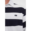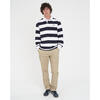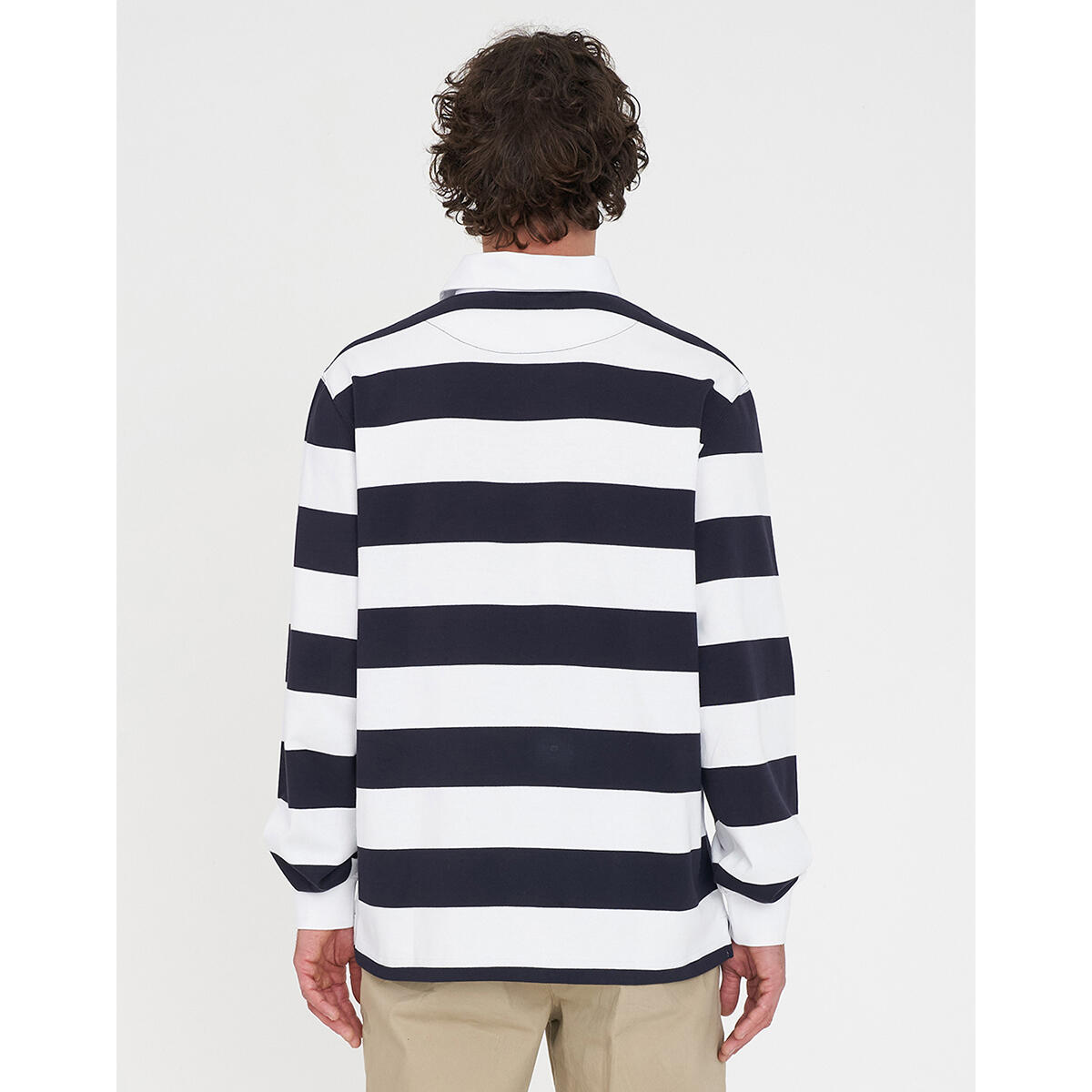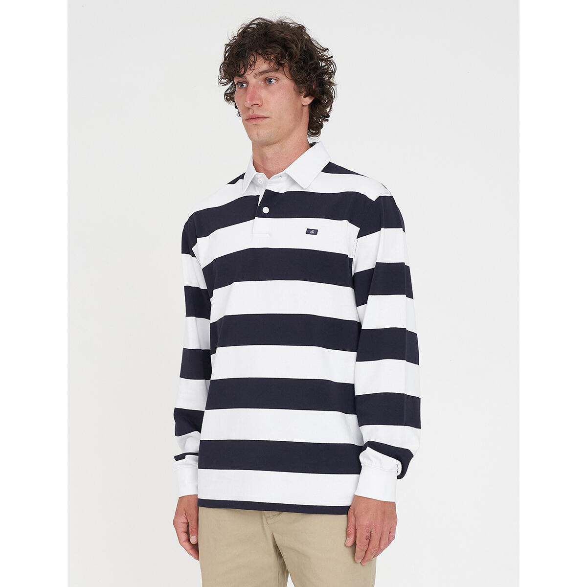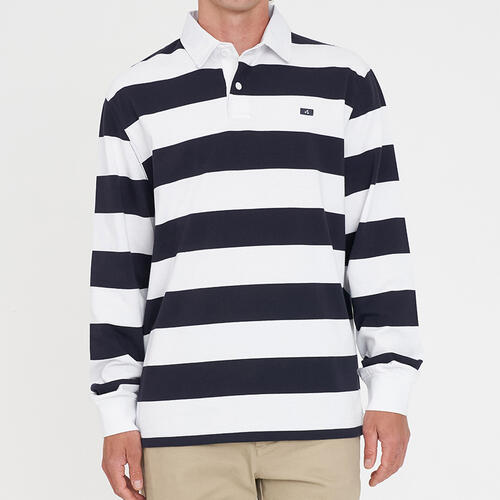 • What you need to know: 100% Cotton, 280gsm, Rugby knitted stripe, Classic fit, Contrast drill collar, Ribbed cuffs, Long sleeve, Huffer branded embroidery badge