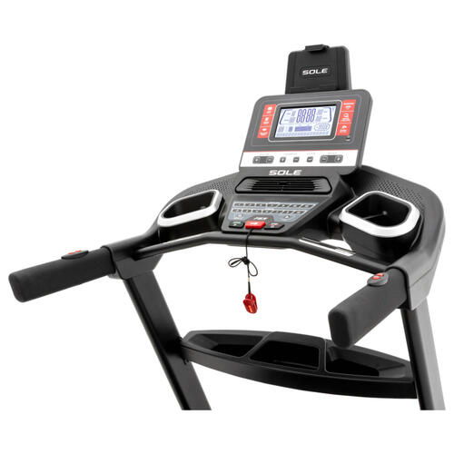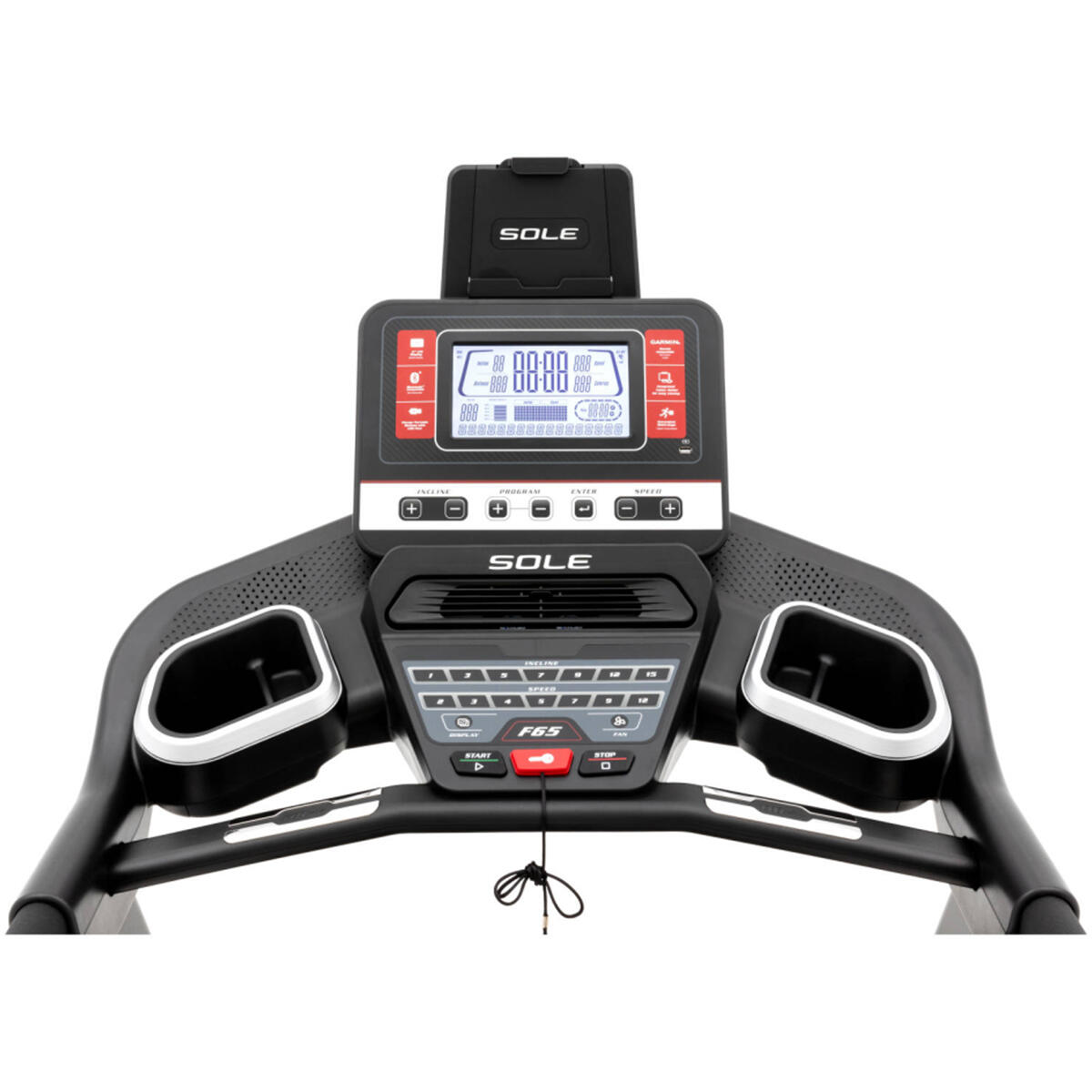 The Sole F65 treadmill features cooling fans and speed and incline controls on the armrests for added convenience. The user-friendly console displays Speed, Incline, Time, Distance Travelled, Calories, Pulse, and Pace. Integrated speakers allow you to connect your media device and play music during your workout.