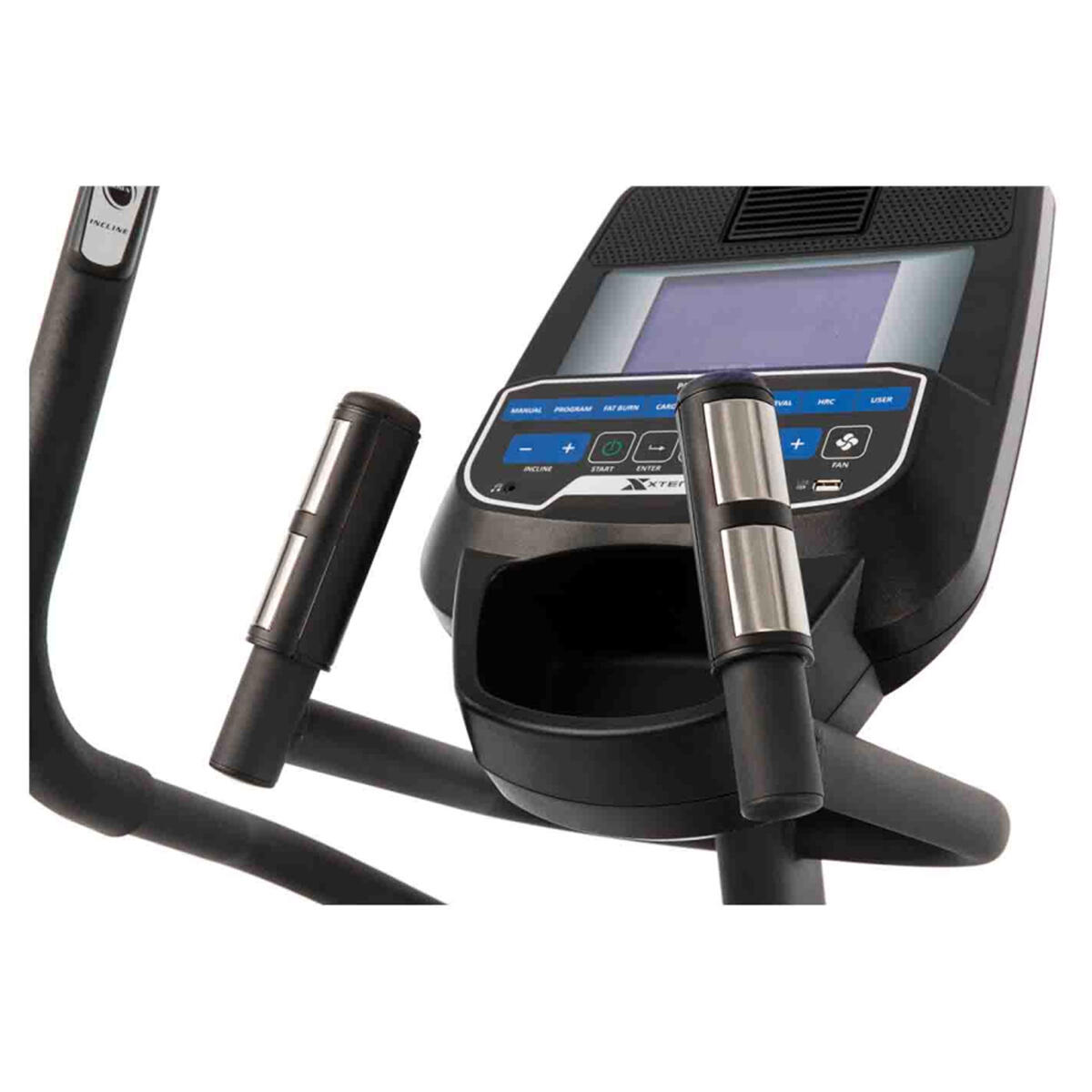 • Dual action handlebars with contact heart rate grips on stationary bars
