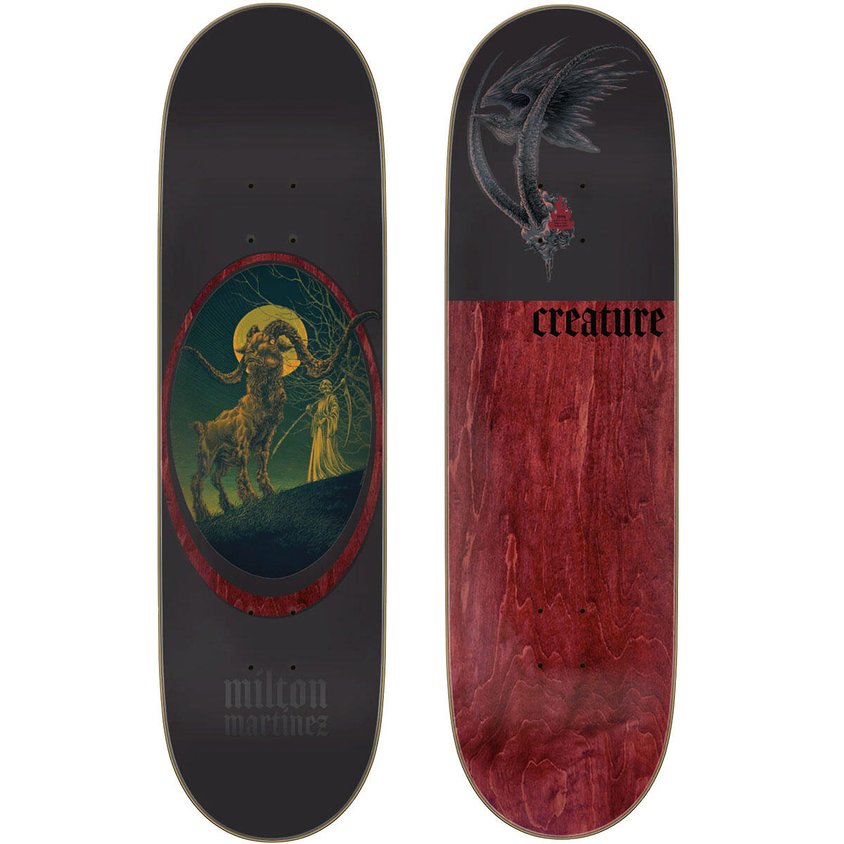 The Creature Martinez Guardian Pro Hailing from the land of North Macedonia, artist Pig Hands inks up a healthy dose of heavy psych for three of our heaviest street punishers. Introducing the Guardian Pro series, featuring matte and gloss inks with blood red veneer knockouts all on the agile 14.25” wheelbase Stumps shapes.